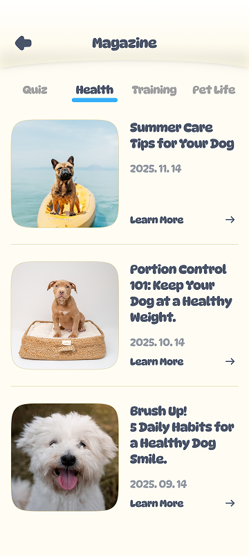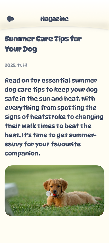 먹이 주기, 산책 거리, 수면 패턴까지 — 모든 기록은 반려 맞춤 케어로 이어집니다. AI가 제안하는 더 나은 루틴과 리포트를 통해 반려의 하루가 한층 더 건강하고 가까워집니다.