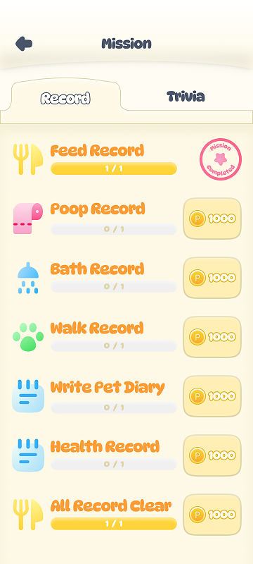 반려를 위한 작은 행동으로 보상이 쌓이는 즐거움을 느껴보세요. 기록은 습관이 되고, 반려와 함께하는 일상의 가치를 만듭니다.